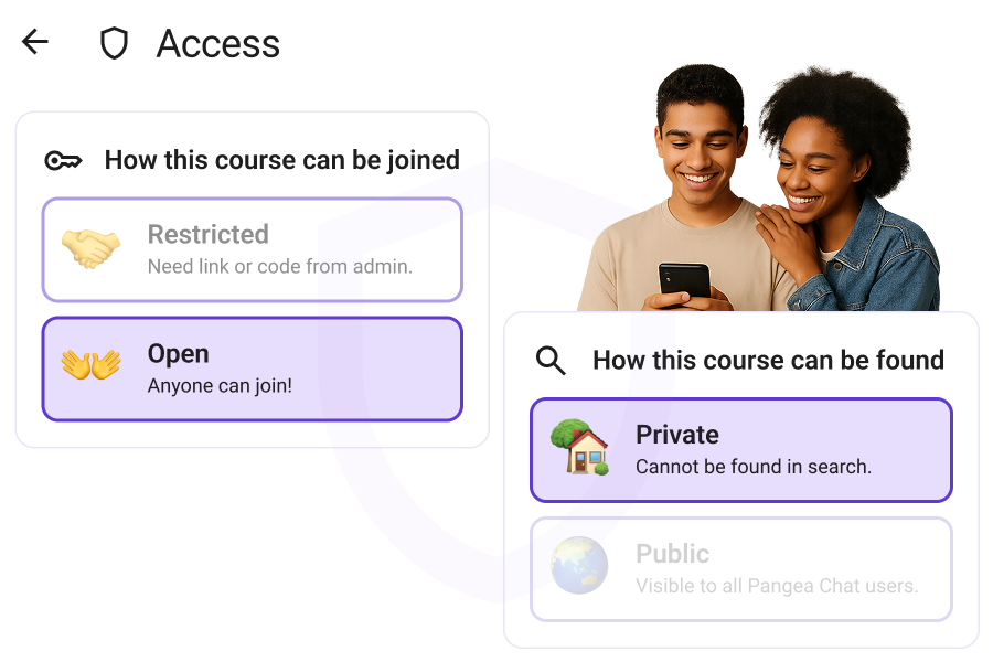 FERPA, COPPA (Age 16+ self-certification), and GDPR compliant. We never sell user data or use it for advertising. Messages are processed by AI to provide learning feedback. Course admins control who can join, can delete any message, review reports, and remove users. For institutions that need full isolation, Pangea Chat can run as a completely separate, private network.